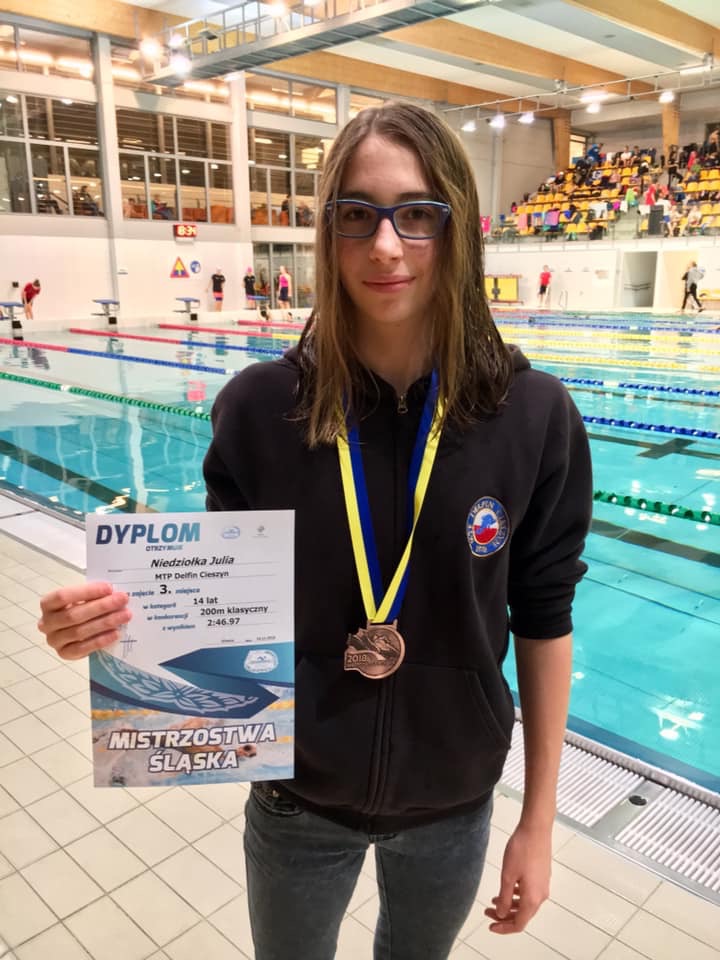 Brązowy medal na 50 dowolnym z piorunującym czasem 28.24‼️ Ponadto 7 miejsce na 200 dowolnym 2:17.33 oraz 8 na 400 dowolnym 4:52.64 (wszystkie rezultaty to bezwzględnie najlepsze czasy w historii Cieszyńskiego pływania). - Julia Niedziołka – Dwa Brązowe medale na 200 klasycznym (2:46.97) oraz 400 zmiennym. Niewiele, bo 4 raptem setne sekundy zabrakło również do brązowego medalu na 100 klasycznym (1:17.55) ostatecznie 4 miejsce, 5 miejsce na 50 klasycznym oraz 6 na 800 dowolnym.