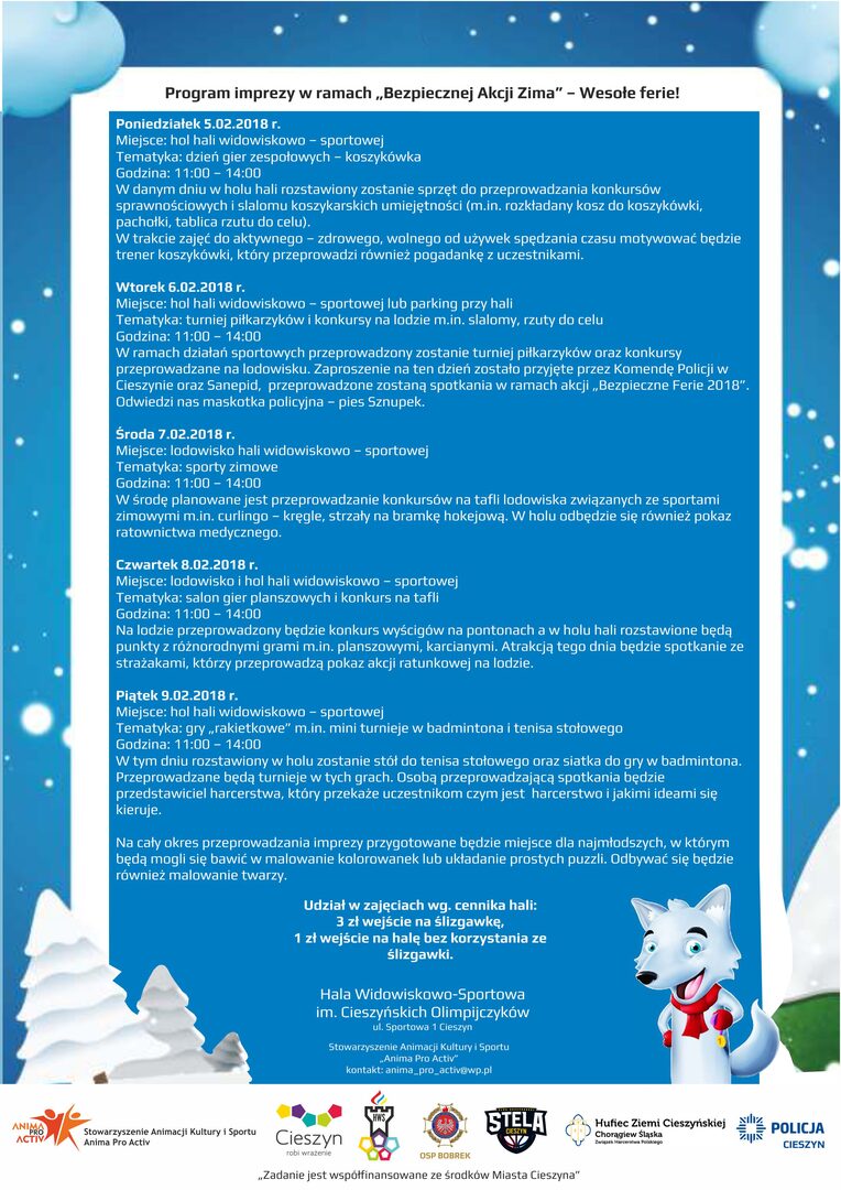 W ramach działań sportowych przeprowadzony zostanie turniej piłkarzyków oraz konkursy przeprowadzane na lodowisku. Zaproszenie na ten dzień zostało przyjęte przez Komendę Policji w Cieszynie oraz Sanepid, przeprowadzone zostaną spotkania w ramach akcji „Bezpieczne Ferie 2018”. Odwiedzi nas maskotka policyjna – pies Sznupek.